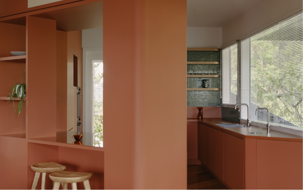 In the laundry, entered from the kitchen through a set of noren curtains, Laminex Porcelain Blush on the benchtop works seamlessly with the Laminex Burnt Ochre of the cabinets. It’s an earthy, arts and crafts dream, like living inside a ceramic kintsugi peach, pops of gold holding all the parts together. It’s an apt metaphor and descriptor of the Blackwood home; an old space that needed repair, using gold to fill cracks and breaks, and in the process, becoming more beautiful as a result.