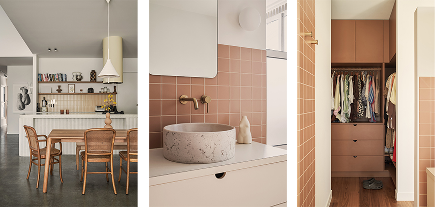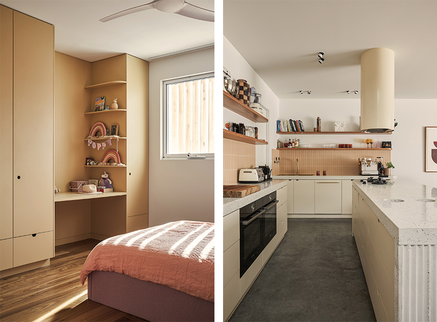 Laminex French Cream, Pale Honey and Burnt Ochre tie wet spaces to bedrooms, wardrobes to living spaces, and “it works beautifully, looks great, is cost effective and easy to clean and maintain,” says Brady. The specification of Laminex products “was absolutely client-led and contributed to the success of the project. Nick and Sophie made the final call on the Laminex colours and their placement in the house,” finishes Brady.