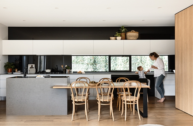 Case in point is the abundance of Laminex AbsoluteMatte. Almost all interior vertical surfaces – in black - feature the premium super-matte laminate. Its ability to absorb light, a key benefit in a house such as this, was integral, but once the kitchen joinery was specified, the hall, storage, dividing walls and bedroom cupboards all followed suit. It is no doubt a high-end detail, but in a project where coherence and consistency is the specification, it becomes essential.