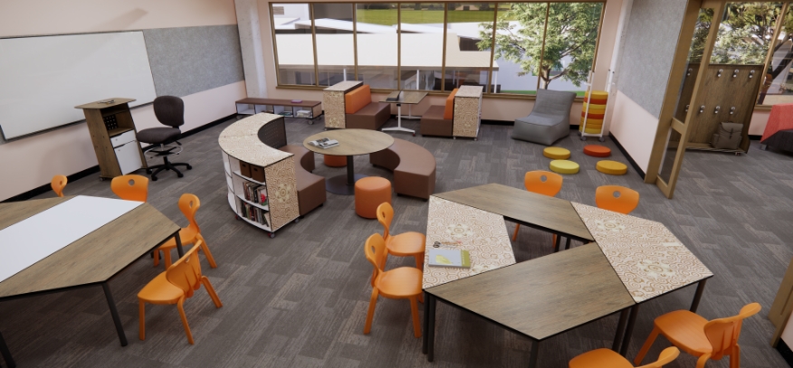 Initially Bekue’s artworks were taken and reimagined in a series of textiles and fabrics for a range of seating and ottomans but has since expanded to include hard surfaces like tabletops, cabinets and lockers – essentially anywhere Laminex CustomArt could be employed within the Woods’ range of school furniture.