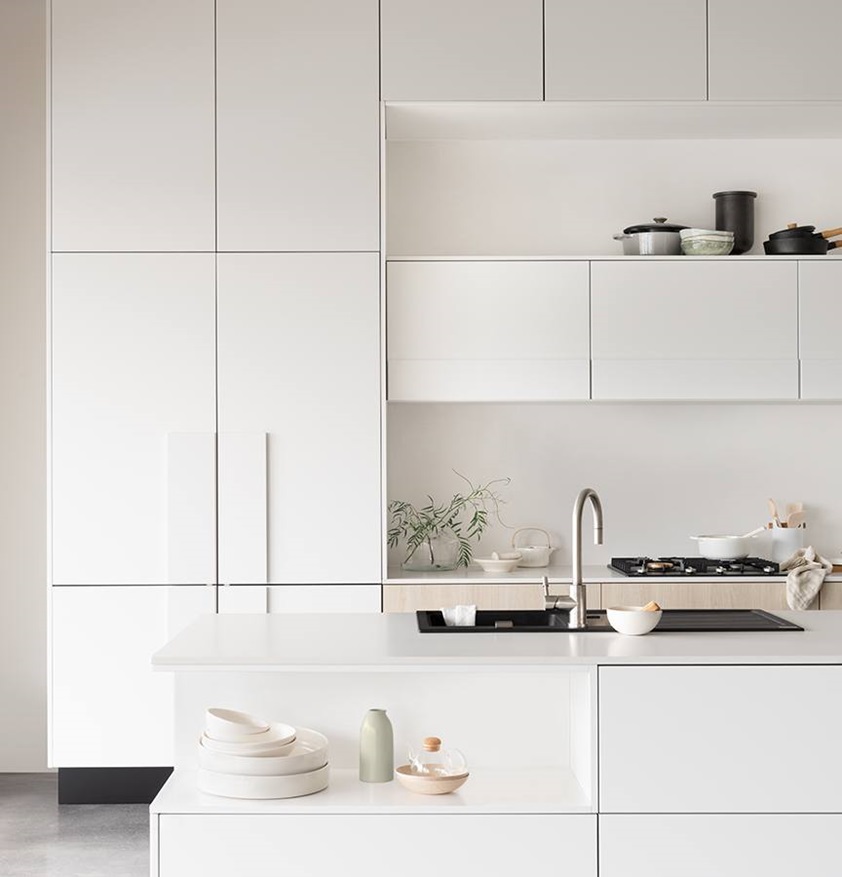 The core element of white’s true character is its base tone. This refers to the shade that’s been applied in its production. Yellow tinted undertones create warmer whites and grey or blue undertones will produce a cool white. “You need to be clear about what a white’s base tone is, because that will tell you what colours and materials to pair with it,” explains Valente. “And it works the other way too, so if you’ve already chosen a benchtop, you should then look for white cabinetry with an undertone that complements the benchtop colour.”