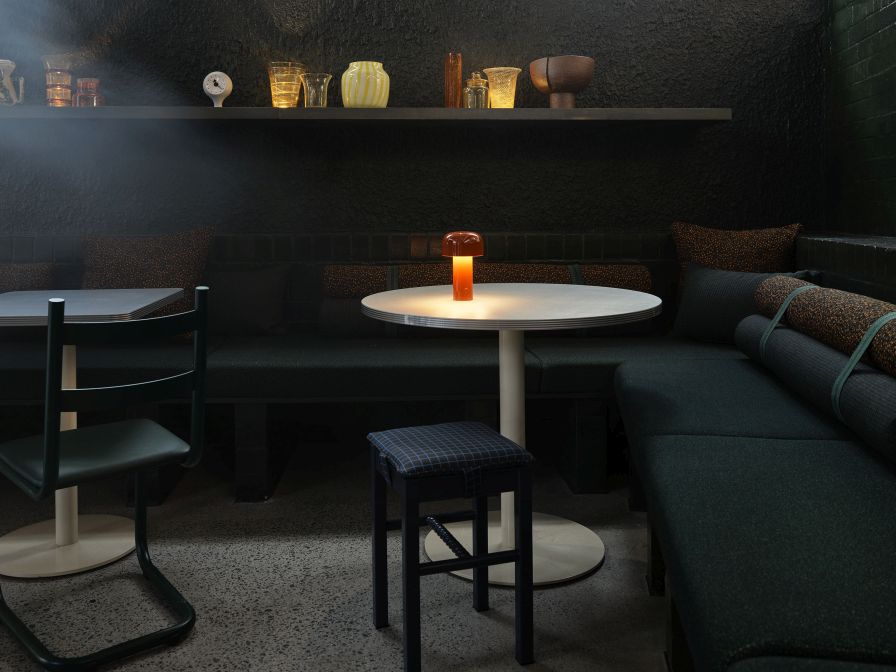 Tabletops in both the upstairs dining area and downstairs bar were fabricated with Laminex. Upstairs, it’s brilliant red Laminex Pillarbox. Downstairs, a selection of three decors that bring tactility and play of light – Laminex Plex Argent and Aluminium Forte from the Metallics range (no longer available), and the textural blue of Laminex Reclaimed Denim Fibre in Plex finish. “I wanted a shimmery finish that reflected the light diffusion, and on a practical level, a material that was hardwearing, given that the surfaces would need to weather food and drink spillage plus cleaning fluids. Timber or glass were never going to cut it,” Ghoniem explains. “Best of all, I got the exact surface colours I wanted.” The four decors come together beautifully with the various iridescent and textural surfaces, amongst the light and shadows, in what is a quite wonderful space, and an extremely cool place to hang out on a Friday or Saturday night.