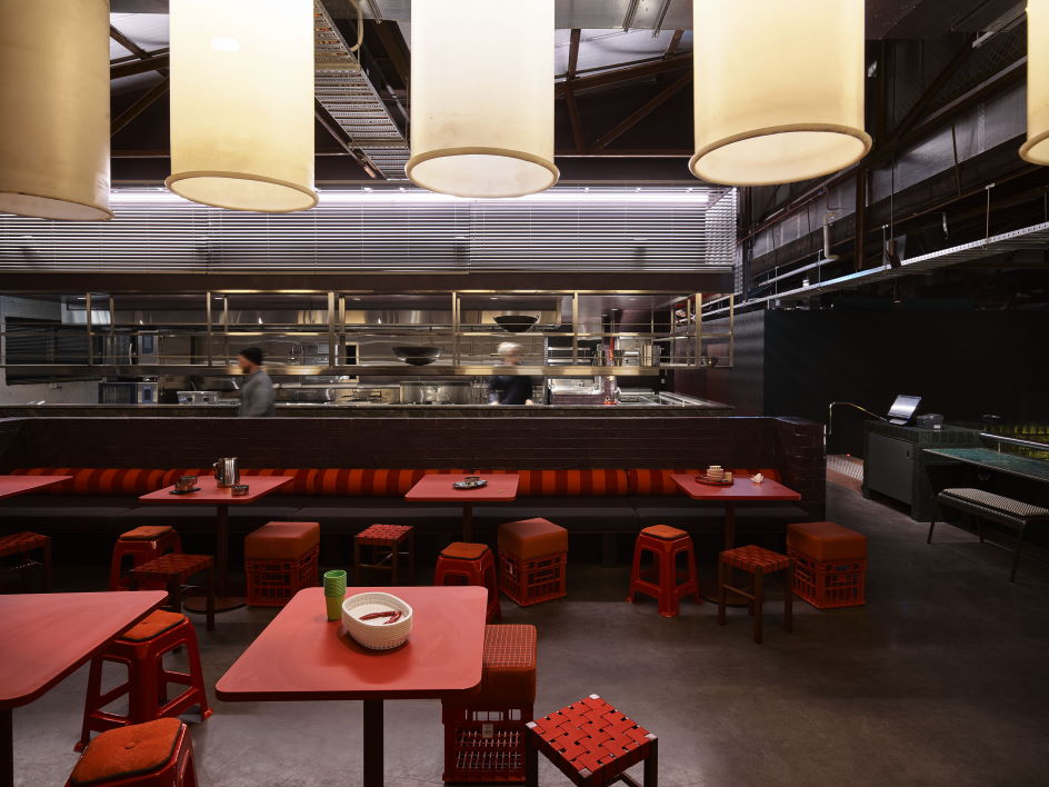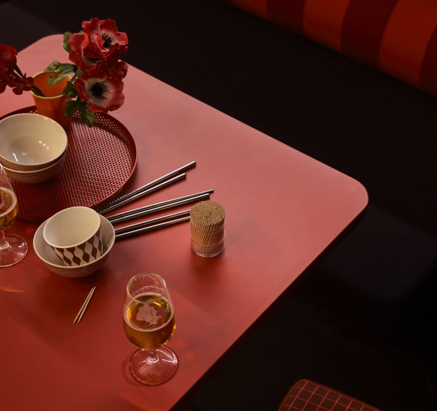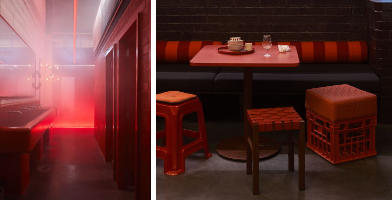 Lighting plays a key role in the design, creating a sense that objects are glowing in the dark, a nod to classic 1980s movie Tron. And, while the space is undoubtedly moody and dramatic, YSG has certainly not been afraid to use colour, including a lime-green Pyrolave bar top downstairs, furniture and upholstery in a range of greens and blues, and even some strips of acid-yellow plastic that hang from the ceiling like an art installation. Upstairs, where the kitchen pumps out Thai snack food, the colour is ramped up even further, with a theme of firecracker red that takes in dining tables and seating, as well as bathroom basins and fittings, which positively pop against black and white walls. And on the way to the bathrooms, a strip of red lighting along the floor, which gives Atomic Beer its most Tron moment!