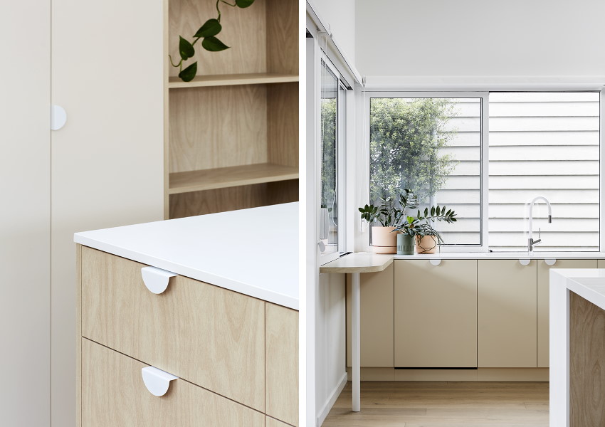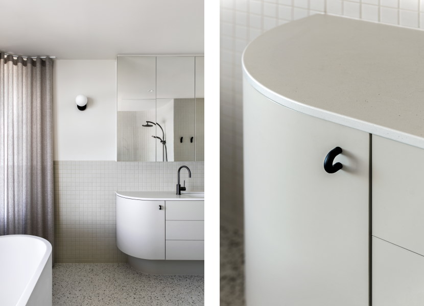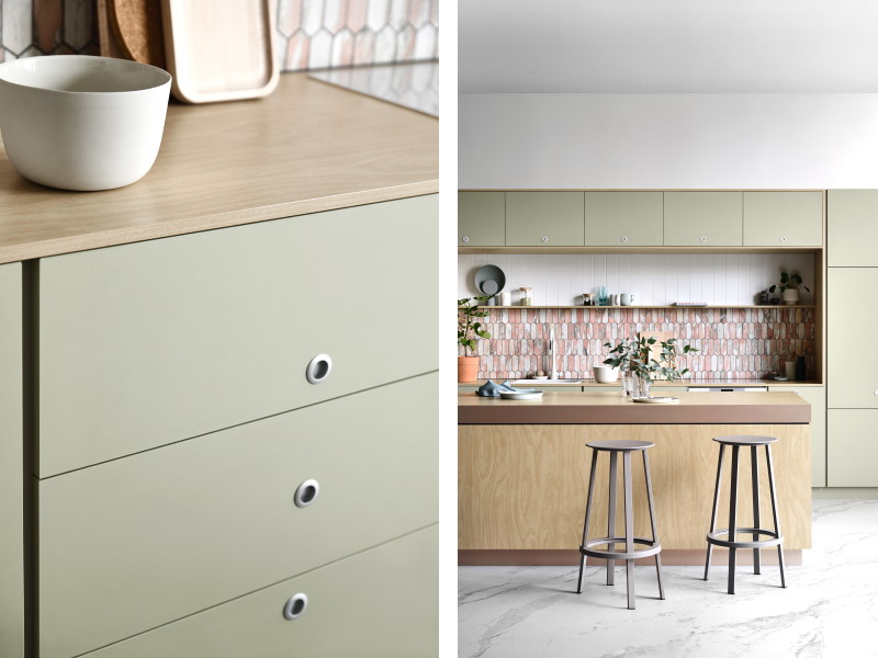 Leech’s own Country Kitchen project was designed to showcase Laminex AbsoluteMatte Surf. “We wanted to convey tactility and warmth, but also feel like the space was overall a neutral one,” Leech explains. “We balanced the Surf decor with natural green undertones in the wall finishes, adding the seemingly imperfect handmade texture of tiles and porous corkboard to make the kitchen feel less formal.”
