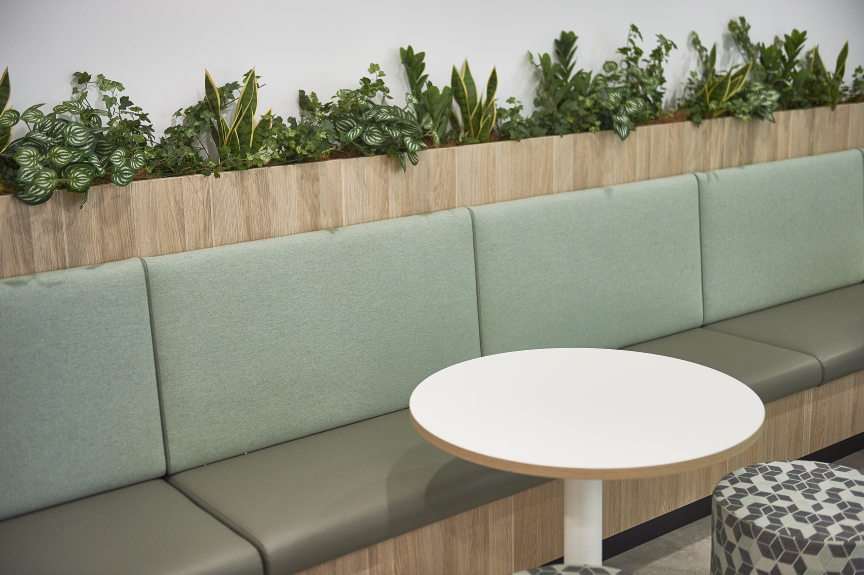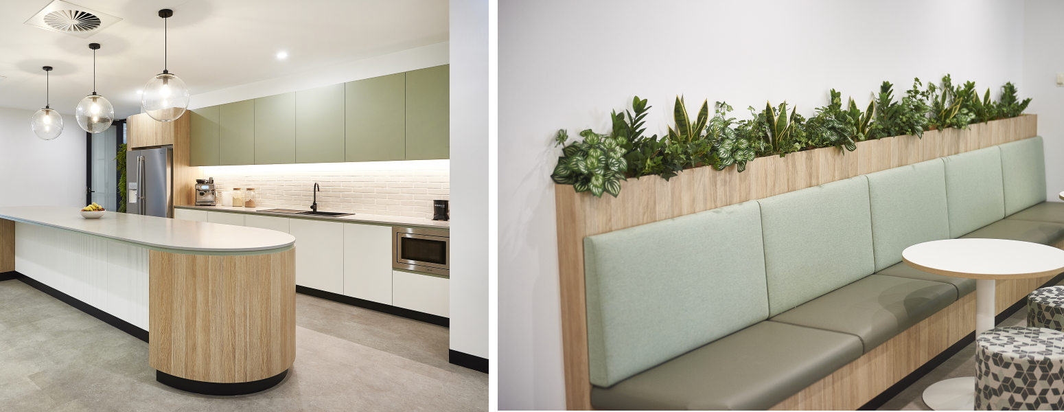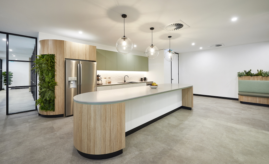 There’s a large island bench in the communal kitchen, its rounded ends constructed from bending plywood that’s been cold-formed with Laminex Classic Oak high-pressure laminate (HPL), and banquette seating throughout the space, again made with Classic Oak, using cold-formed HPL for the curved elements and decorated board for the straight sections. But perhaps most striking are the curved sections of wall, that combine cold-formed HPL surfaces with vertical slats made from decorated board. Again Classic Oak is the hero decor, but its enlivened by contrast with Laminex White and the muted organic green of Laminex Bayleaf. A fourth Laminex decor, timeless Black, also appears in the space – used for recessed kickers, it creates the impression that the joinery is floating.