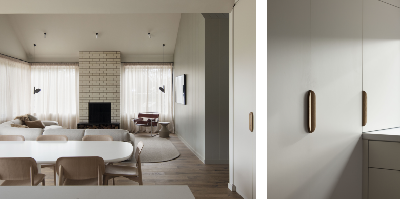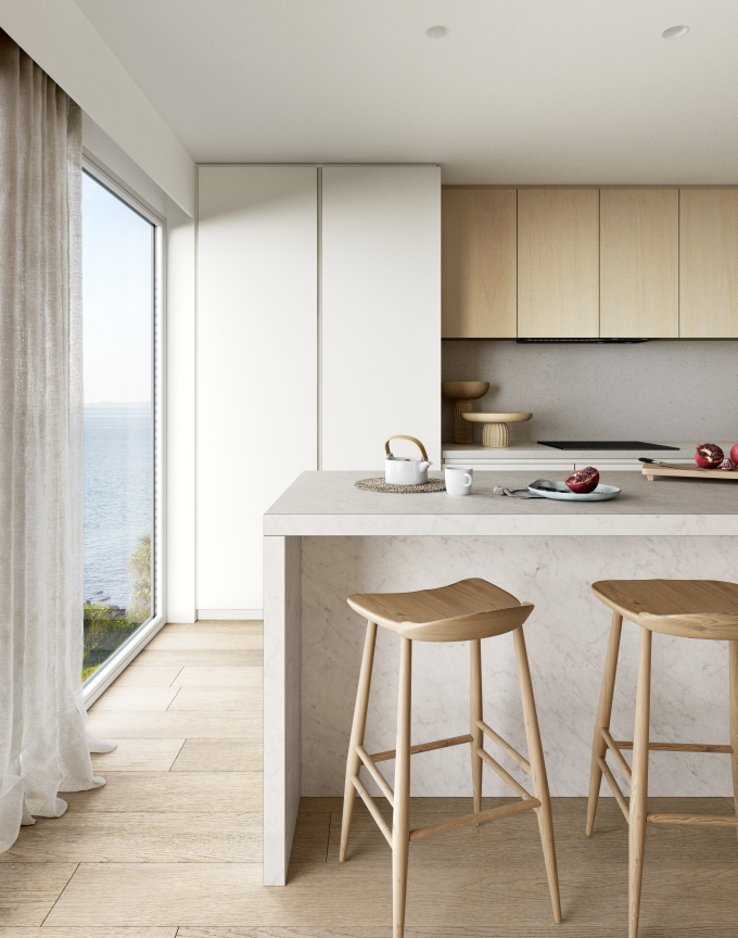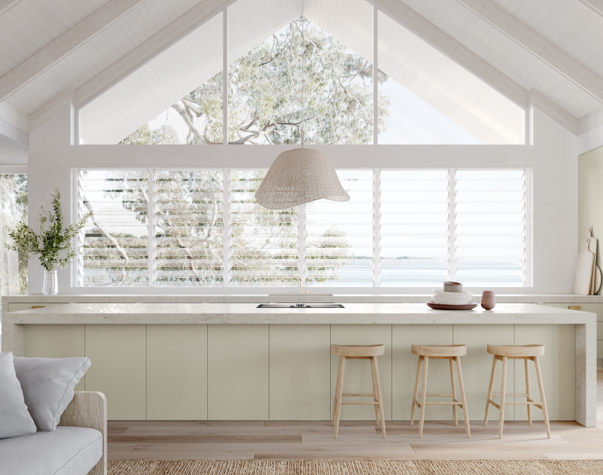 Muted organic green tones have emerged as a strong colour trend in recent years, not only because they look beautiful, but because they provide a sense of connection to the natural world. That makes them an excellent fit for coastal interiors, particularly in lighter shades, such as the delicate, earthy green-grey of Laminex Seed. Applied to cabinetry and panelling across the front of the island bench, Seed’s eucalyptus tones make a natural pairing with timber flooring and furniture. But then, showing that coastal interiors can easily accommodate a more luxe aesthetic, marble-look Essastone Marmo Bianco has been used for chunky benchtops and the sides of the island bench. This decor was chosen for its ivory base, which has a warmth of tone that allows it to sit comfortably with the timber and earthy green cabinetry.