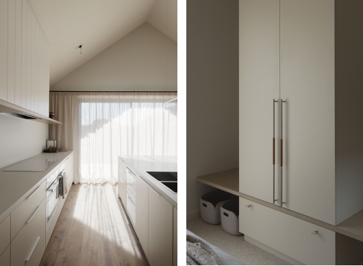 A hallmark of a truly relaxing contemporary coastal interior is an emphasis on subtle shifts in colour and texture, and avoidance of stark contrasts. You can see that here, in the choice of Laminex Waxed Maple for overhead cabinetry and Carrara Bianco for the island bench. There’s a consistency between the clean woodgrain and soft linear marbling in terms of both their scale and their level of refinement. The rear benchtop and splashback feature Essastone Ash Concrete, its smooth grey concrete colouring picking up the warm grey veining of the Carrara Bianco and the darker tones in the Waxed Maple’s grain. And then Laminex Chalk White is used for tower cabinetry, the warm white decor providing the perfect soft base for highlighting the woodgrain and marble textures.