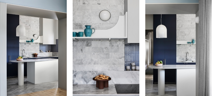 “Of course, we started looking at blues, but not the obvious blues that you might think about, but more restrained blues and that’s how we tied Laminex in too, with the gorgeous French Navy from the AbsoluteMatte range. It has a beautiful, almost velour feel to it. You feel like touching it. It has a velvet quality which makes it feel a lot richer and deeper. It became a very important part of the palette.”
