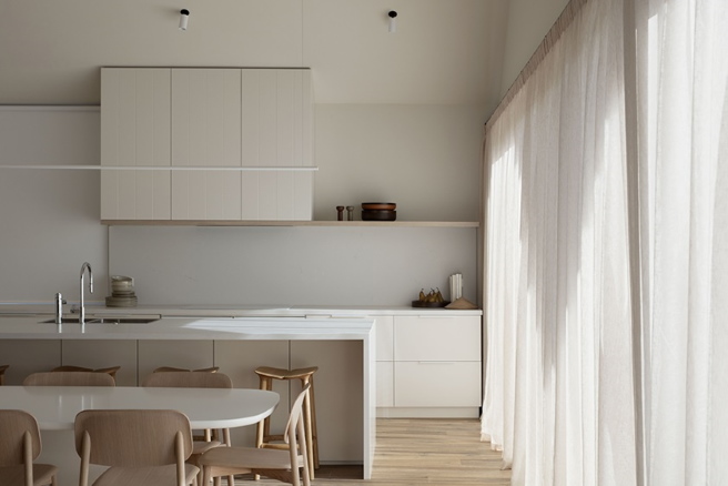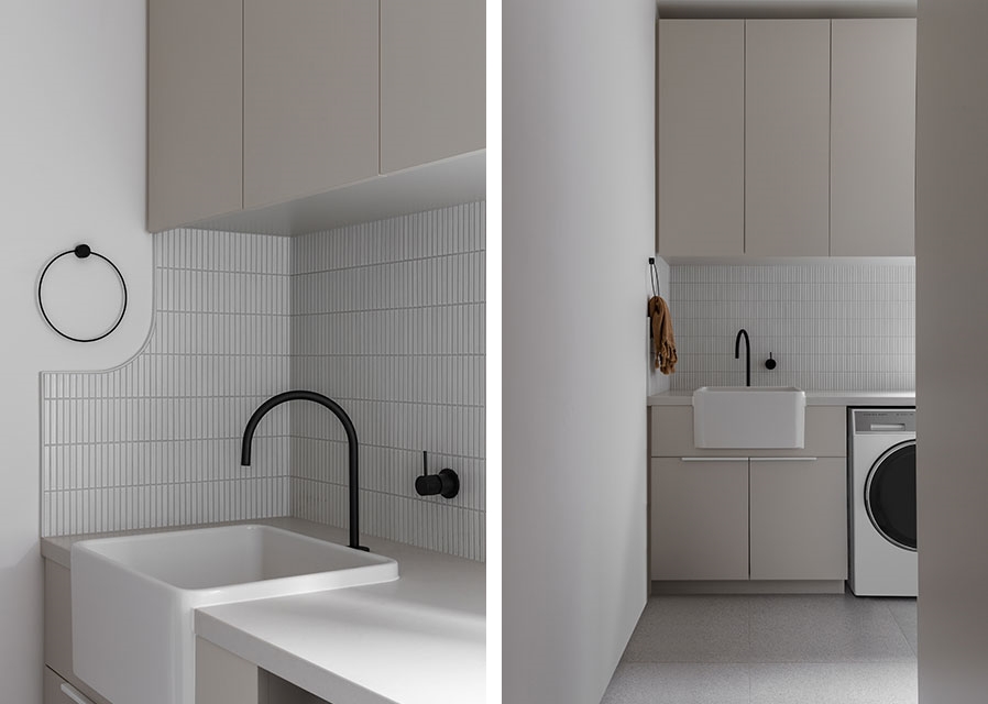 The pared-back aesthetic is further accentuated by a natural colour palette and refined materiality. Greys and creams instil a sense of calm, while American oak floorboards add warmth and Tamil granite benchtops and vanity surfaces bring texture. Finger mosaic tiles offer visual interest, especially on a wonderful curved rangehood cover, and green-grey Laminex Sarsen Grey laminate catches the eye with its soft, natural-feeling tone. The laminate decor was used in the home’s most hardworking areas – the laundry, main bedroom walk-in-robe and children’s bathroom – where James-Herrick needed surfaces to look good, but also be hardwearing. “We chose Laminex for its durability, great colour match, soft matte texture and cost effectiveness,” she explains. “It also seamlessly integrated with the other materials in the palette.”