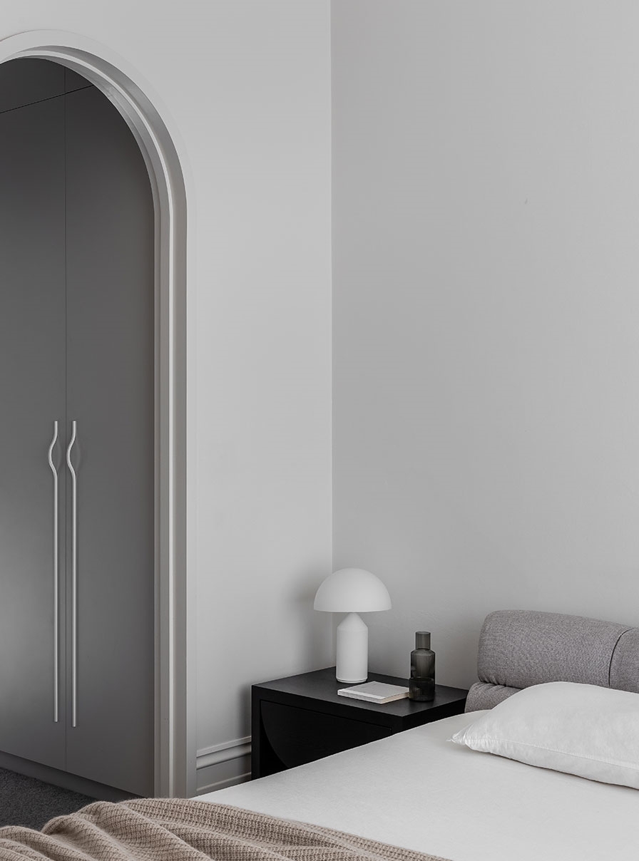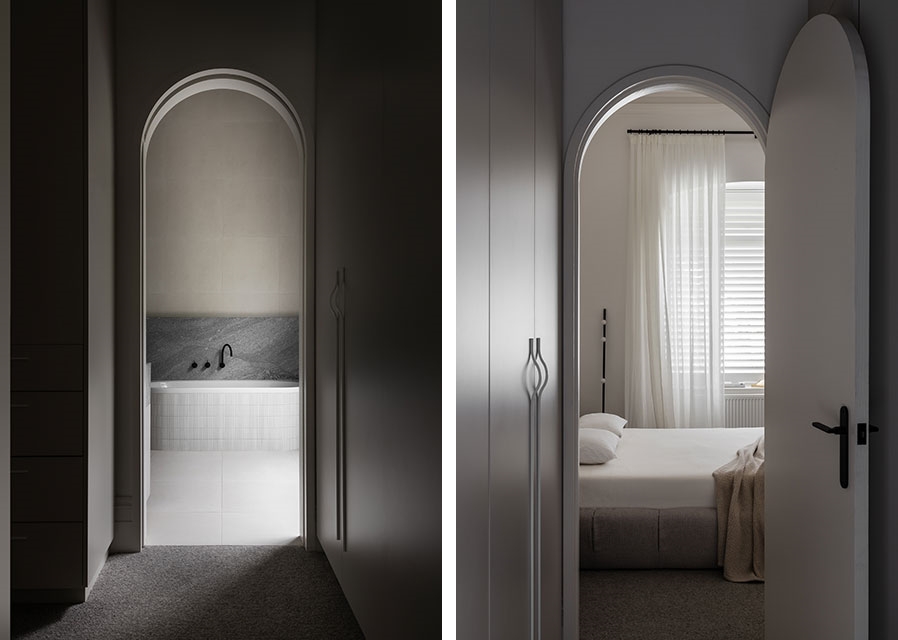 Creating a rationalised layout involved demolishing a number of walls to make way for more open spaces, and reconfiguring the floor plan for greater usability. The clients also wanted the interior to feel contemporary yet still respect the four-bedroom home’s traditional character. James-Herrick introduced simple curve motifs and arches that play off the original house’s old-world charm, and steel windows that echo the exterior’s lines and angles, making for an elegantly minimalist outcome with gently sculptural qualities.