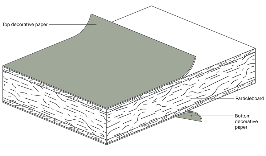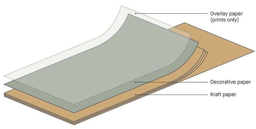 Low-pressure melamine (LPM) – the decorated board used for cabinetry, doors and drawers – is different in that it’s made with a core of medium-density fibreboard or particleboard, but its outer surfaces are also made with melamine-impregnated decorative paper. You can learn more about the production process for both HPL and LPM in our quick guide to laminate and decorated board.