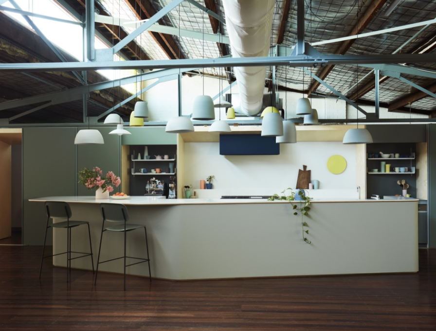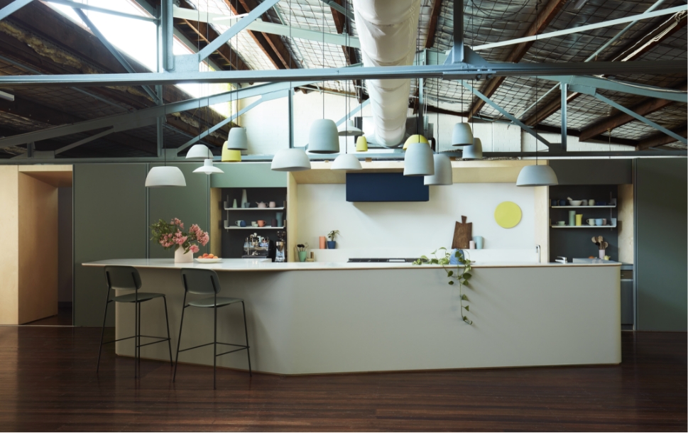 Melbourne’s DesignOffice uses a pair of contrasting Laminex products to tie a multi-purpose home and workspace together in colour and philosophy. The oversized kitchen providing the centre point for partners and staff to come together at different times in the day.