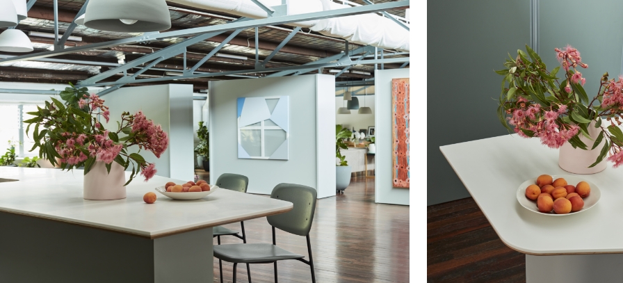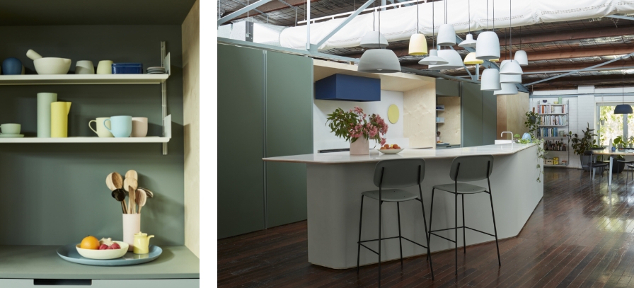 “[We worked with] Laminex Absolute Matte; it has a deep and saturated use of colour, but a completely flat texture, and HI-MACS, which when matching the matte of the Laminex with the lustre of the HI-MACS just brings the subtlety of the palette together that works with the Mud product.”