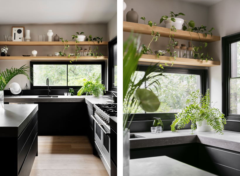Egan’s material choices were primarily made for aesthetic reasons, but she was also mindful to design a kitchen that was low maintenance. With two small children, she didn’t want fingerprints showing up everywhere and the fingerprint-resistant AbsoluteMatte Black surfaces certainly deliver in this respect. As do the timbers and concrete surfaces. In fact, they sit together quite beautifully, bathed in natural light but free from the glare and reflections that come with glossier materials. It makes for a quiet, relaxing space, the ideal setting for family life.
