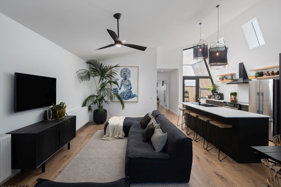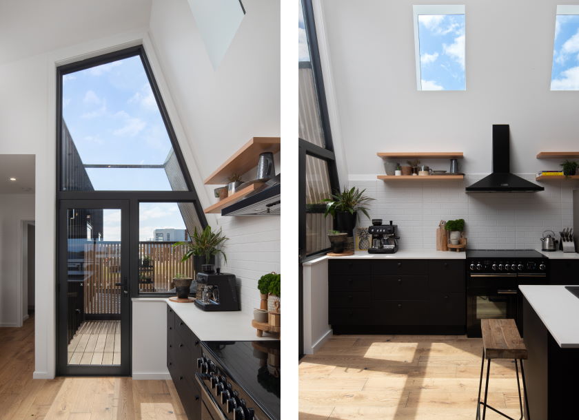 Its robust exterior combines black steel, recycled brick and hardwood cladding in an asymmetrical form that puts a modern spin on the classic A-frame beach shack. This translates to an interior with a spacious ground-floor living area and a soaring oblique ceiling. Skylight windows bring in plenty of natural light, which bounces of the crisp white walls, illuminating every corner. And taking centre stage is an expansive, strikingly designed kitchen. It features concrete-look island and rear benchtops, with glossy white subway tiles on the rear splashback providing textural contrast and Tasmanian oak shelves adding warmth. And then Laminex AbsoluteMatte Black for all vertical cabinetry surfaces, doors and drawers. Teamed with a black oven, rangehood and dining table, these strong black elements mark the kitchen as the focal point of the home, as well as providing a connection to the steel on the exterior.