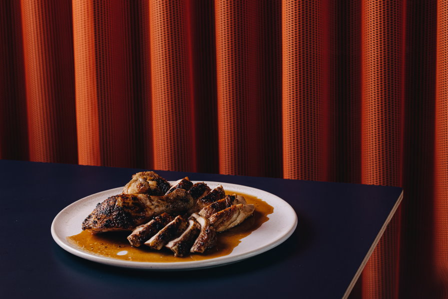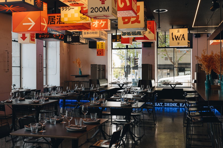 For all of the buzz in this restaurant, however, it still very much provides for a relaxed and enjoyable dining experience. This comes down to the spatial design, and also a deftly curated material palette. To temper the effect of all that colour and light, there are the natural-feeling, authentic textures of timber, concrete and existing structural elements that have been left raw and unfinished. There are also tables retained from the previous restaurant tenancy but reborn with tops in Laminex AbsoluteMatte French Navy. “The existing tables were unique and we liked the idea of retrofitting them because it’s a way of telling the story of the space, like Robata is the next chapter,” Calic explains. “And of course, doing this reduces waste.”