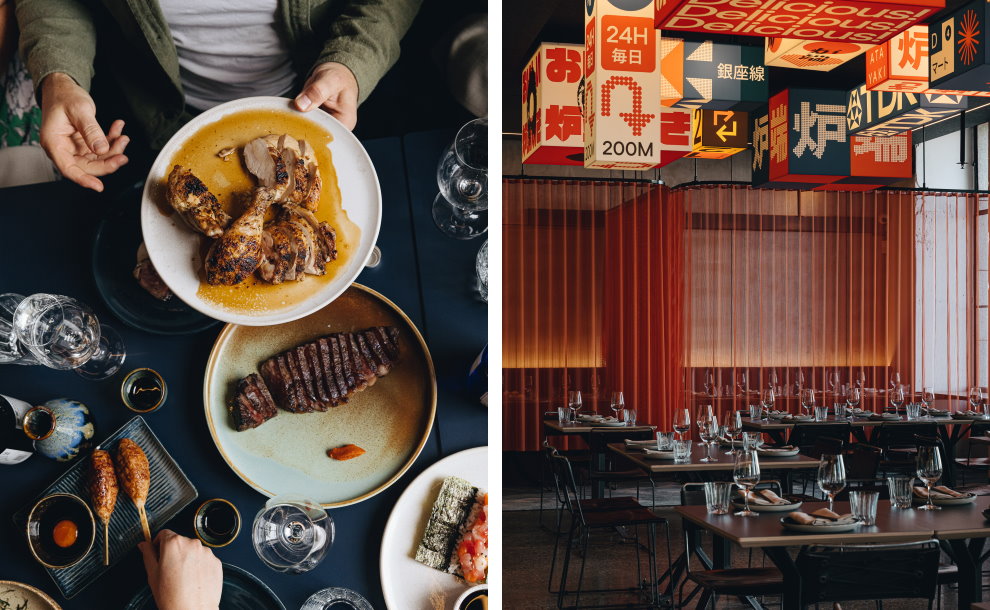 It’s often said that design can transport us to a different place and nowhere is it truer than at Robata, a new Japanese grill restaurant located at the corner of Exhibition and Flinders streets in Melbourne, and designed by multidisciplinary design practice Ewert Leaf. Such is the contrast between the grey stone streetscape and the restaurant’s neon-lit interior, walking in off the footpath genuinely feels like passing through some magical portal. Brightly coloured lightboxes hang from the ceiling, scrolling LED signage reflects in the polished concrete floor, diners sit at tables and booths, and perch along the kitchen bar, and all around is the tantalising smell of meat cooking over charcoal.