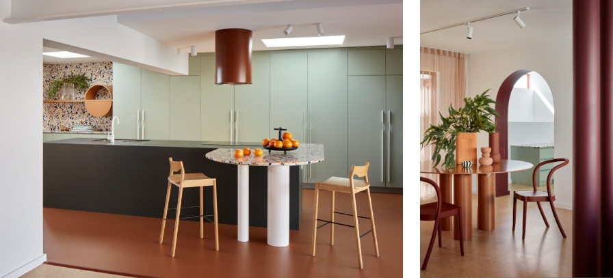 Step inside Playhouse and each room brings its own personality and story to tell, with a surprisingly controlled and composed outcome. There are familiar State of Kin signatures present of course; rooms are divided by archways, and mirrors, vanities and furniture all feature circles and curves, but this isn’t retail, and the terrazzo and granite are so effective because of State of Kin’s sympathetic colour blocking. In the kitchen, the soft green of Laminex Bayleaf occupies an entire wall of cabinetry, acting as tonal complement to the dark green benchtop and wonderfully paired Marmoleum Terracotta floor. This is a home that never shies away from the challenge, but “never turns into a cluster of crazy,” says Salomone with a laugh and a smile.