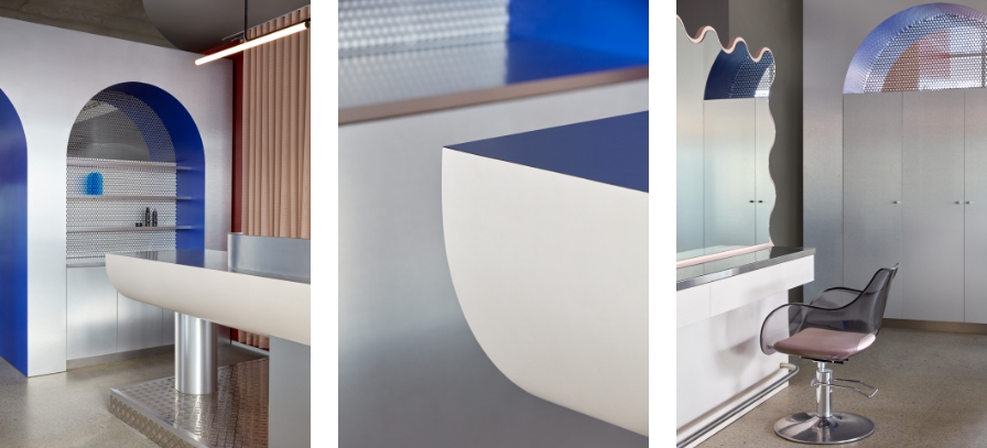 Holding its own alongside chequer plate and perforated steel, a partition of wavy, Sottsassian curves cuts a striking line in Laminex Porcelain Blush, buying some privacy for those at the wash chairs. It counters the harder tones of the room balancing the palette, complementing the Laminex Kalamata and the Dulux Dublin Red of the walls in an ode to the avantgarde movement. But, perhaps most of all, it’s fun.