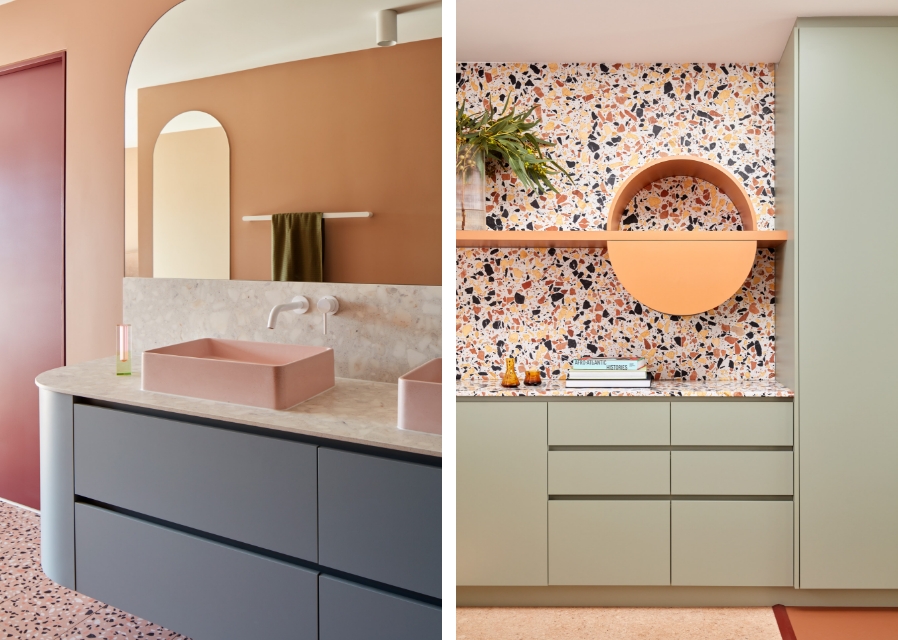 Pressed porcelain sinks in the bathrooms feel like oversized lollies, pressed out of musk Lifesavers rather than colourful clay. Formica Bluegrass and Laminex Just Lilac complement these elements perfectly, riffing on the terrazzo tiles while bringing their customary durability and resilience to the wet areas.