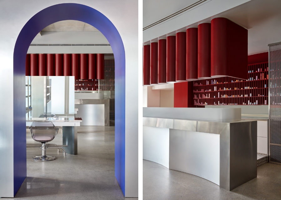 From archways and tables to curvilinear plinths and details, circles dominate. There are S-pleated curtains and curved granite benches; nothing escapes its curvaceous touch, even the perforated steel continues the motif. A coffee machine in bright, Italian red arches its way towards the user. Fritz Hansen and Maletti Plexi Fume salon chairs beckon with their transparency and rounded forms.