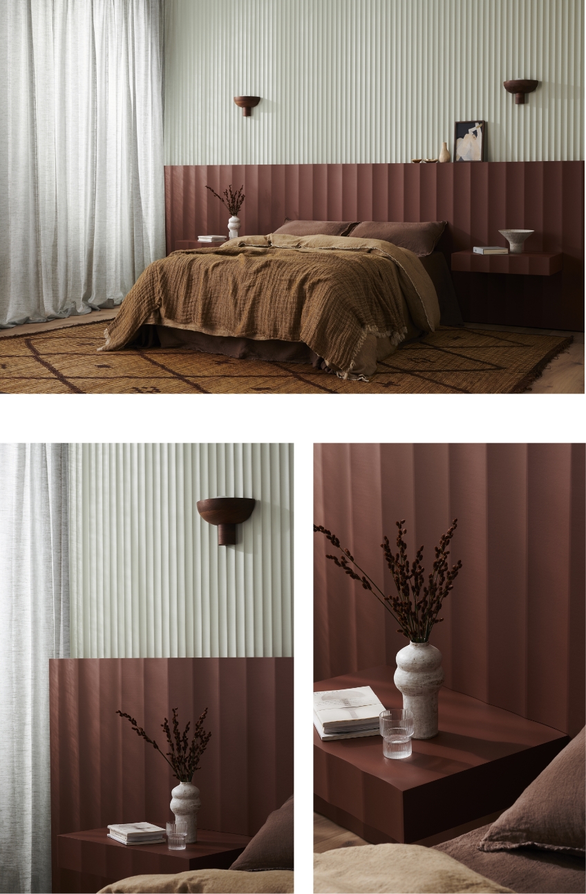 “We really wanted to approach the use of Surround by Laminex like joinery,” Cosentino says of the generous bedhead, “and to create custom elements to show that it’s more than just a wall fitting.” The use of Scallop 45 in Dulux Cat Mint was ground by the use of the new Scallop 135 profile in Dulux Sienna Stone as the bedhead.