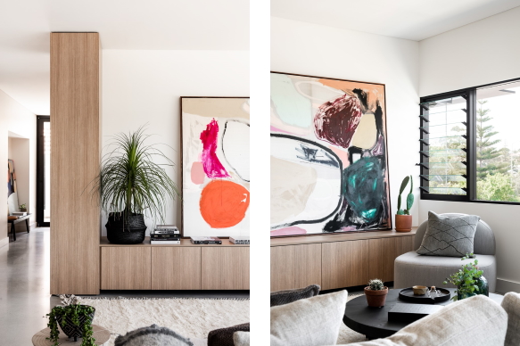 Laminex laminate is Bacic Group’s go-to surface material and Nuic favours Sublime Teak because she believes it’s the most realistic timber-look laminate on the market. “The quality, durability and cost effectiveness of this laminate gives it distinct advantage over veneer,” she says. “Its oversized 3.6-metre lengths also allowed us to eliminate horizontal joints in the entry panelling, which conceals a hidden door to the main bedroom.”