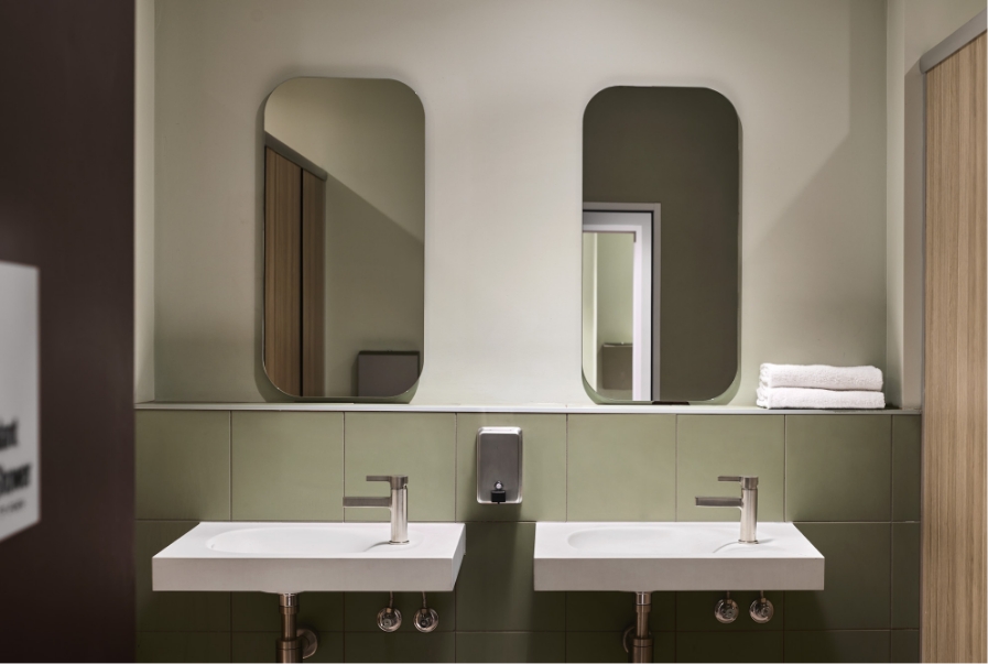 Throughout, Laminex has been used to achieve Studio Tate’s aesthetic cues while also providing sanitary and easy to clean environments. For example, Laminex Aquapanel in White was specified in both shower areas, as it is strong and durable, and expressly developed for areas where moisture resistance is required. Elsewhere, Laminex Porcelain Blush features in the reception area and Laminex Classic Oak, teamed with Laminex Bayleaf, makes a great match for cabinetry and open shelving respectively. In the kitchen, Laminex Pale Honey adds a warm touch with all the practical advantages of laminate surfaces; stain and water resistant, low maintenance and easy to clean.