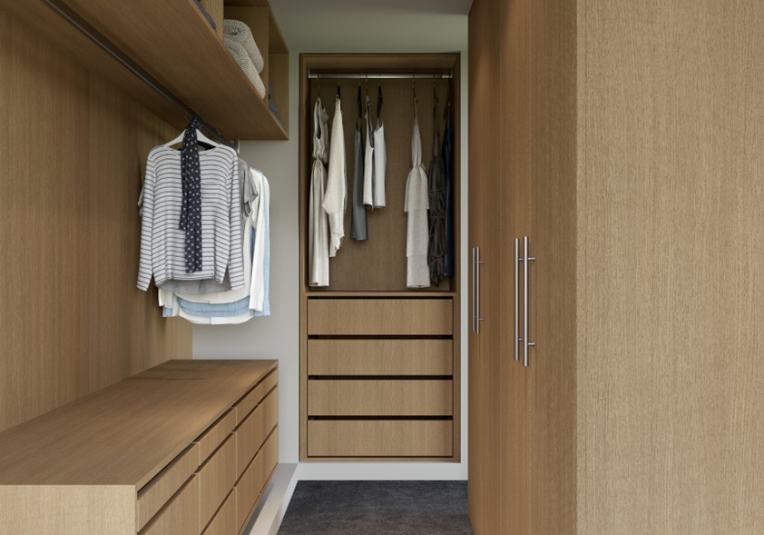 Sapporo Oak throughout provides a contemporary feel making the area airy and bright. Make your walk-in look twice its size by adding full length mirrors edged in black throughout that reflect the Sapporo Oak finishes and Lo&Co pull handles