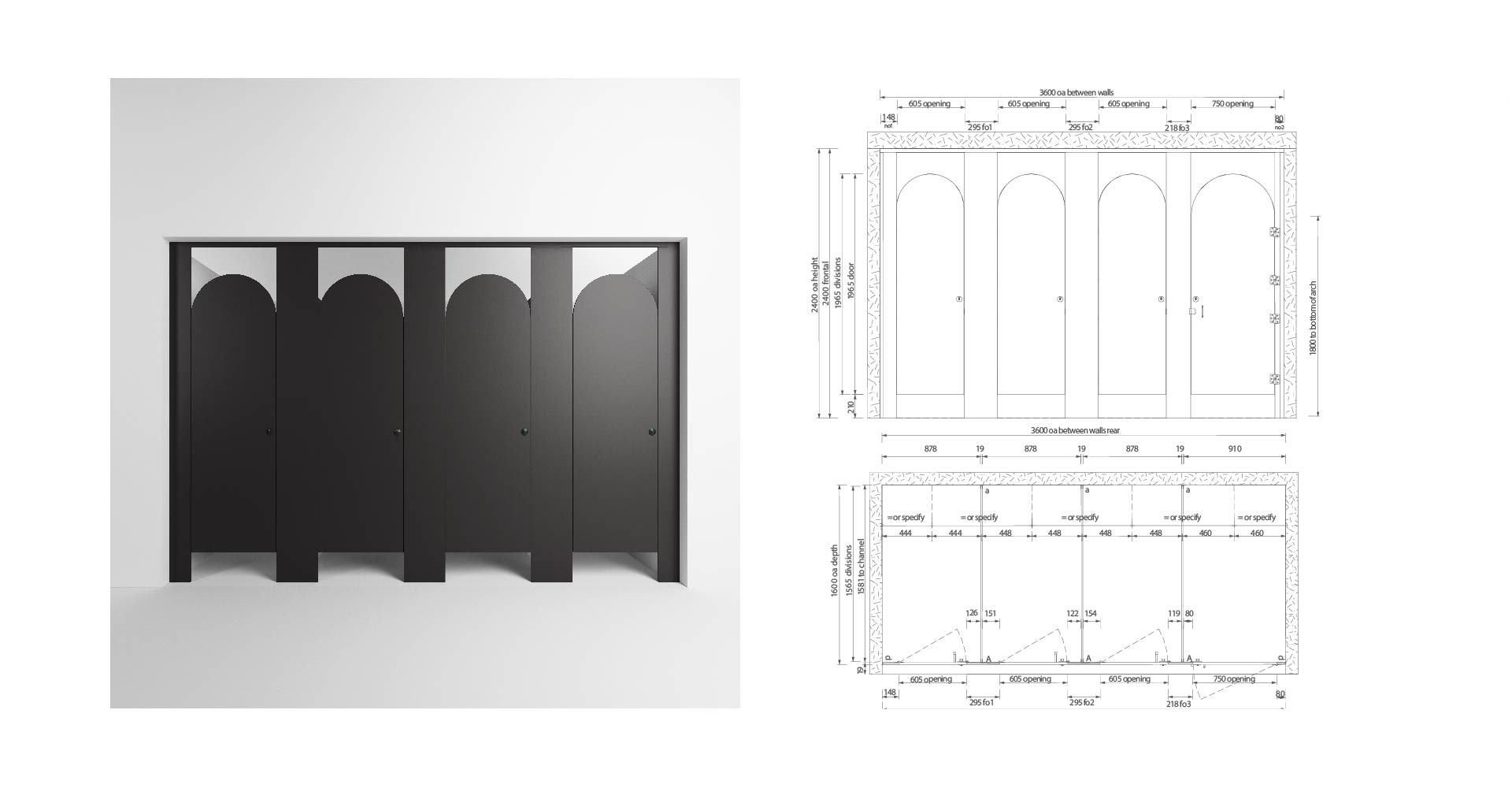 Our new Floor to Ceiling Partition System features generously arched doors, giving a contemporary new design option for public washroom and end of trip facilities.