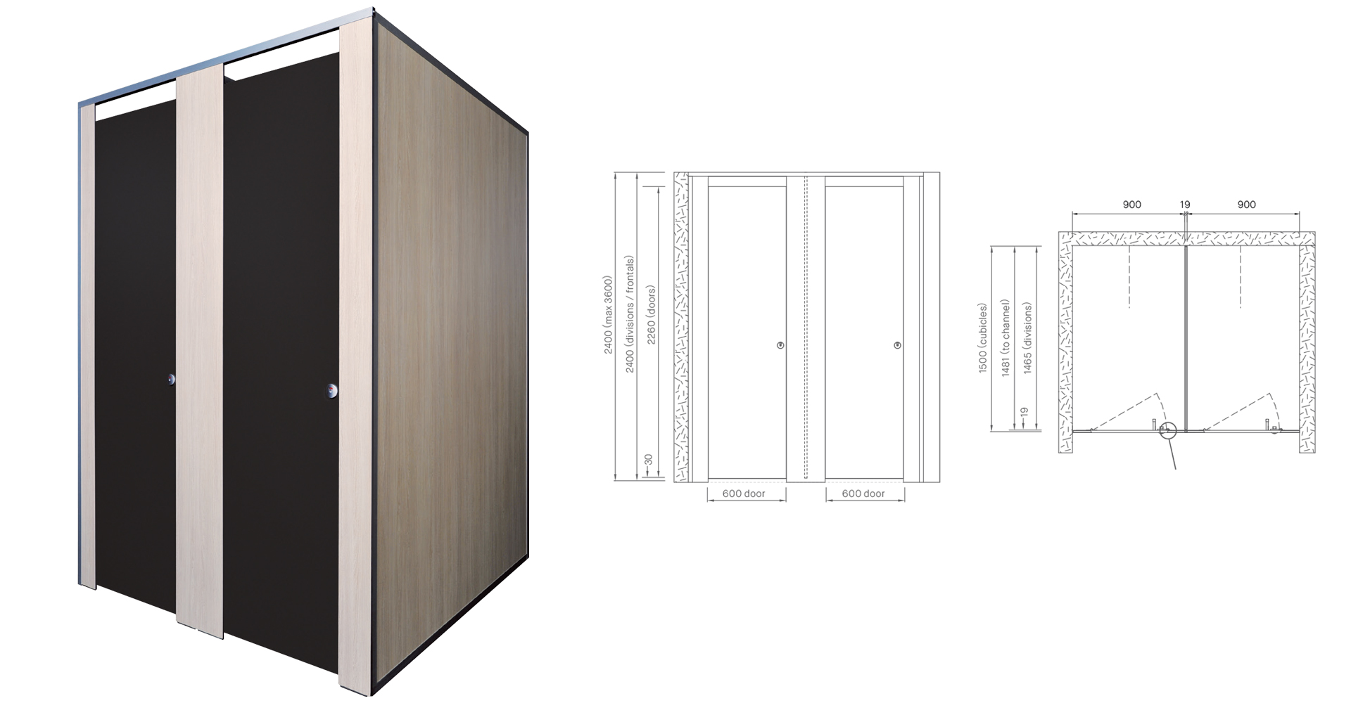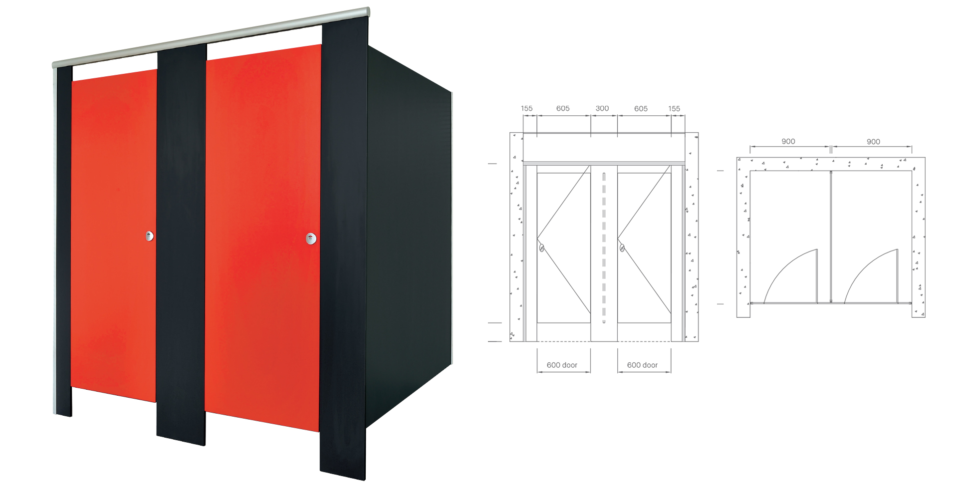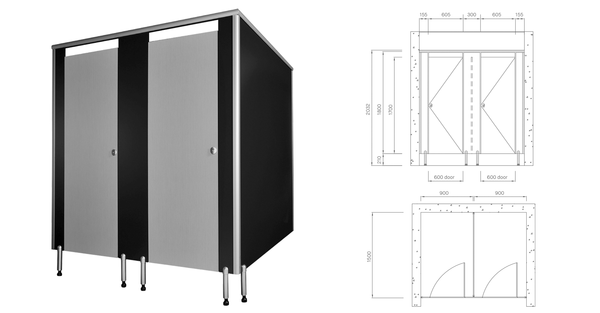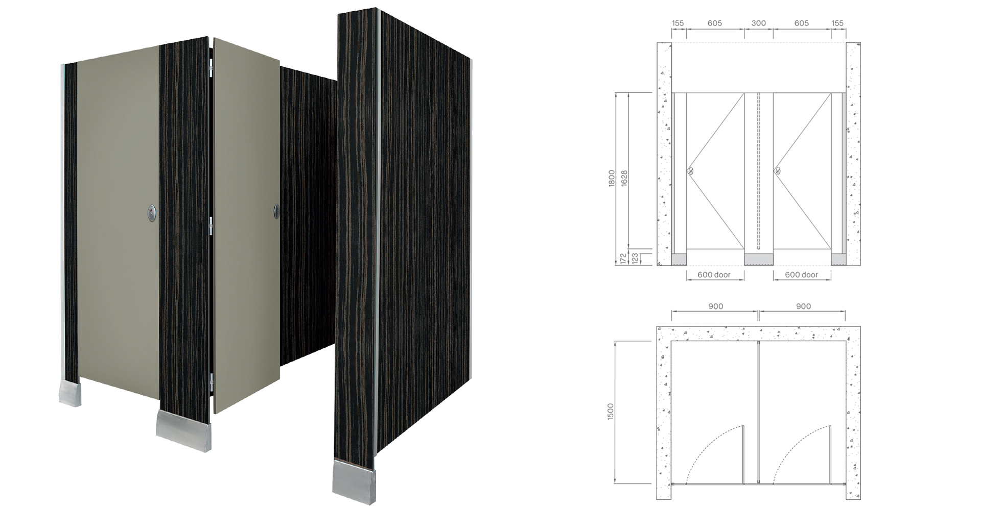 A full height system, mounted floor to ceiling with a specifically designed privacy beveled door. Suitable for unisex applications.