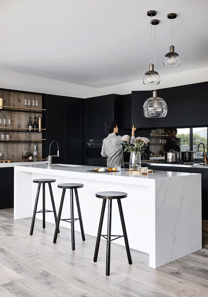 Cabinetry created in Laminex AbsoluteMatte Black adds depth and demonstrates a fabulous contrast to the island bench top in Essastone Unique Calacatta - Gloss in this Glamour kitchen.