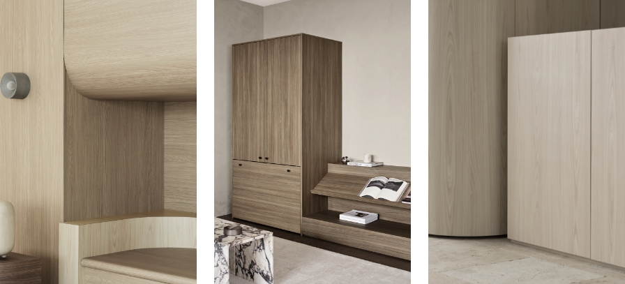 Diving into the Laminex Colour Collection, CJH Studio was tasked with producing four rooms that captured and showcased their signature warmth and creative joinery. Featuring bull nose benches with tight radii, curved shelves, and bulkheads in generous convex and concave forms, Cassie James-Herrick and her team explored the full potential of the Laminex Woodgrain collection.