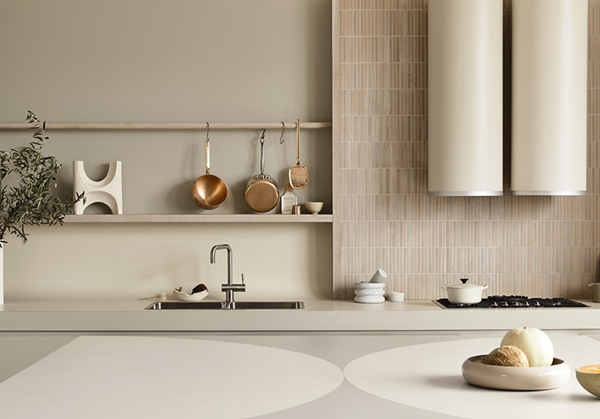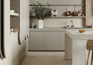 Kennedy Nolan’s brief was quite simple. They were asked to design a large kitchen with an emphasis on neutral decors from the Laminex® Colour Collection. And their response, according to Kennedy Nolan Principal Rachel Nolan, began with careful consideration of the nature of laminate itself. “We started by really thinking about what that material can do. We talked about the idea that you can cut it, that you can put two colours together to make a pattern, that it can be formed into different shapes,” she says.