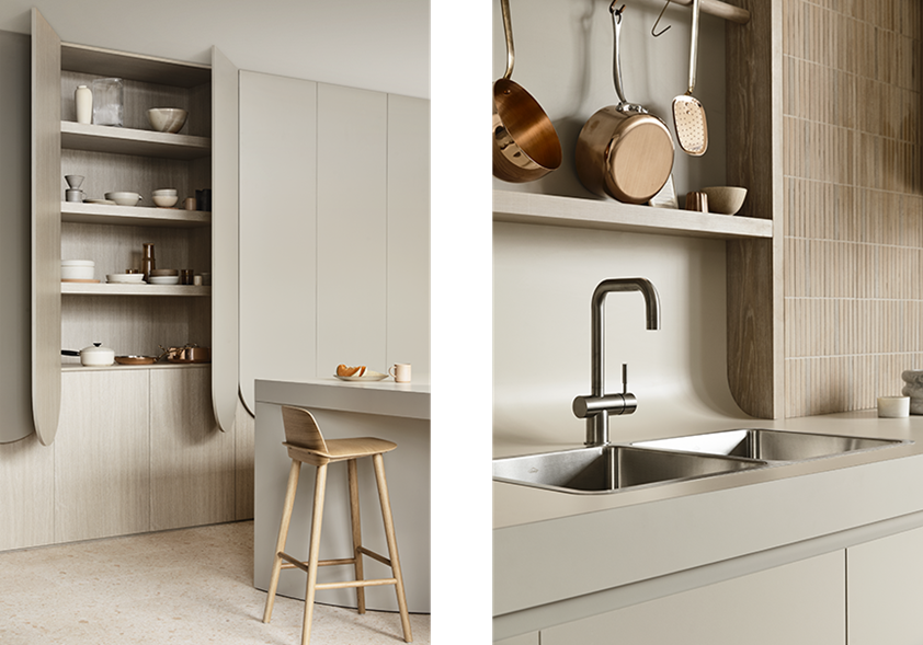 At its upper edge, the splashback terminates neatly at a timber shelf, with a timber rod for hanging utensils. This gives the kitchen a feeling of openness at eye level, and leaves space for another sculptural gesture – twin cylindrical rangehoods, created with Laminex French Cream. Behind them, the wall is covered in Japanese ceramic tiles, their grouted rhythm providing a beautiful textural contrast to the perfect smoothness of the curved laminate.