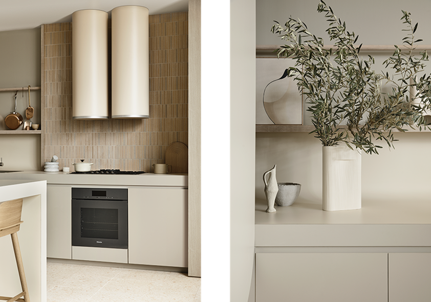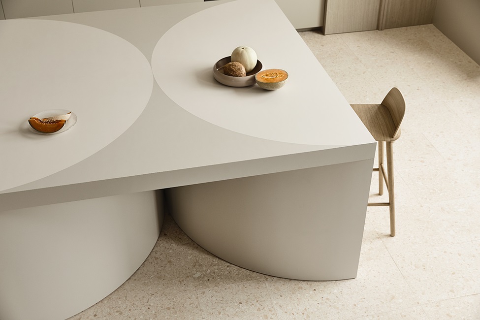 But this kitchen shows how curved designs can be achieved in other ways. On the island benchtop, the featured solid-colour Laminex decors, Paper Bark and French Cream, have been cut and inset into a single flat surface, creating a two-dimensional pattern that follows the shape of the drum legs below. For the scalloped edging on the tower cabinetry doors, Laminex Paper Bark has again been cut into a curving pattern.