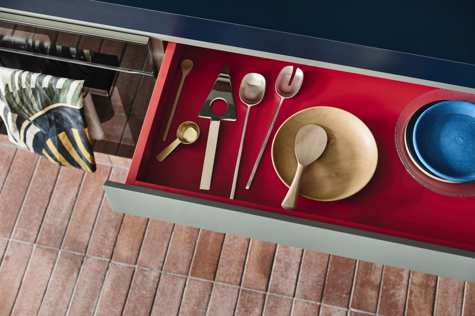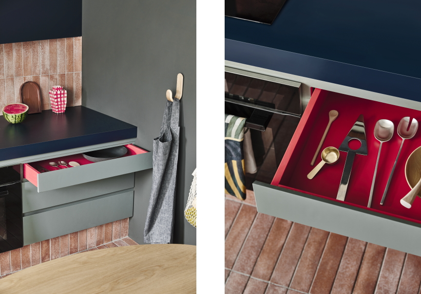 Adding one more layer of pleasure, the inside of one of the under-bench drawers was fabricated from Lamiwood HR LPM in brilliant red Laminex Pillarbox! It’s a bold flash of colour, only visible when the drawer is opened, that brings a moment of surprise and fun in a very sophisticated, very beautiful kitchen.