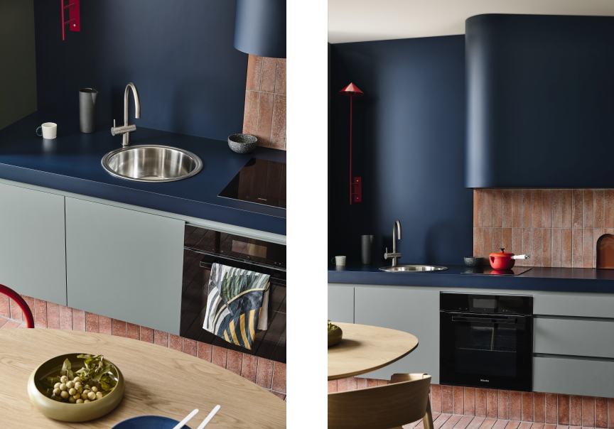But it’s not just benchtops that benefit from HPL’s design flexibility. Above the cooktop, an elegant, wave-like rangehood has been fabricated by cold-forming AbsoluteMatte French Navy HPL over a curved substrate. And to its left, a single sheet of the same HPL has been applied as a splashback that extends all the way to the ceiling. Enhanced by AbsoluteMatte’s visual softness, these two elements add a compelling sense of depth to the “kitchen wall”.