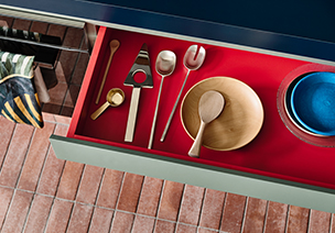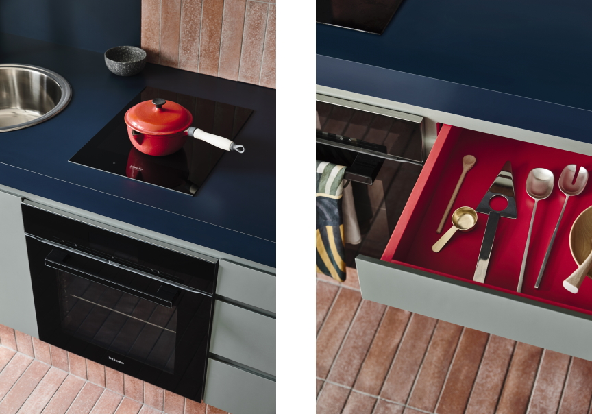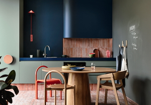 On the floor and a section of wall over the cooktop, rustic terracotta brick tiles bring wonderful contrast with their warm tones and handmade texture. There’s also a wall finished in blackboard paint, which adds an informal edge and coordinates with the darker colours and matte finishes. And then, two flashes of brilliant red – a custom-coloured Volker Haug wall light and hidden, waiting to be discovered, a drawer lined in Laminex Pillarbox.