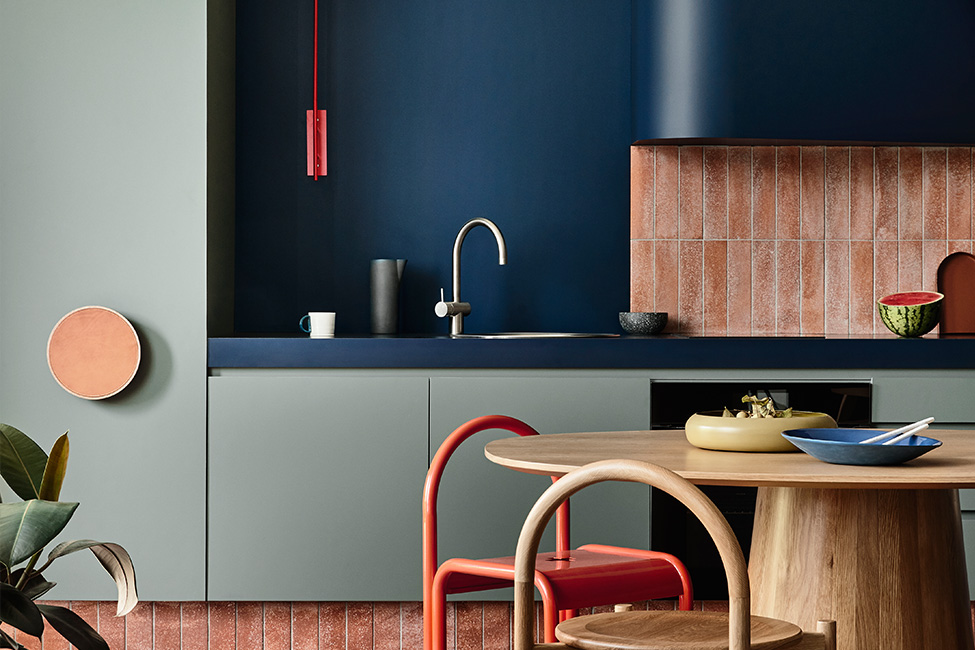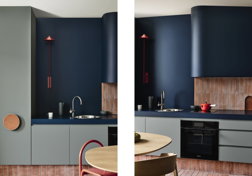 But what really sets this kitchen apart is the care with which Kennedy Nolan has brought these materials together, in particular pushing certain elements of the design beyond standard dimensions to achieve visual effects and deliver greater functionality. For example, where we might expect a regulation 100mm kicker, instead the terracotta floor folds up the front of the cabinetry to the full height of one tile, making a feature of something that’s often an afterthought. This is mirrored in the way the Laminex AbsoluteMatte French Navy above gives expression to a chunkier-than-usual benchtop. And the benchtop itself is 800mm deep – 200mm deeper than standard – so there’s room for appliances and cooking staples to be pushed to the back, while leaving ample workspace in front. In a kitchen that can’t accommodate an island bench, this will have a positive impact every single day.