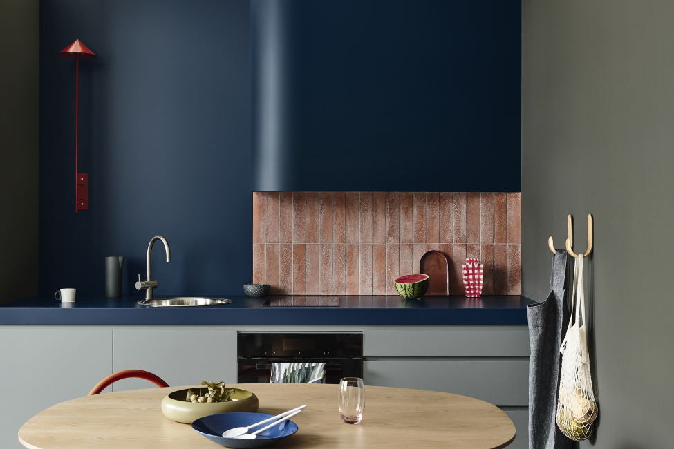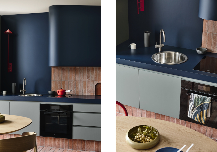 The rise of matte surface materials has been driven largely by the popularity of matte black finishes in contemporary interiors. But Kennedy Nolan’s design here shows the potential for matte surfaces in an expanded range of colours from the Laminex Colour Collection. The Studio Kitchen project palette was built around warm green Laminex AbsoluteMatte Green Slate and deep blue AbsoluteMatte French Navy, paired with rustic Artedomus terracotta brick tiles, which provide wonderful textural contrast. The broader AbsoluteMatte colour palette includes an additional selection of rich neutral tones, as well as whites and creams, and of course, irresistibly cool AbsoluteMatte Black!