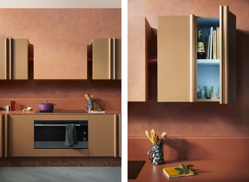 But while the island might be considered the hero of the kitchen, the application of Laminex laminate through the rest of the space is also eye-catching! Most notable are some custom curved elements that required the specialised post-forming services of Newgrove Benchtops, including linear cabinetry door-pulls finished in Laminex Burnt Ochre HPL. Each door-pull was crafted from MDF, which was shaped into its curved profile on a spindle moulder, sanded back and then laminated in a flow-through post-former. There are also shelves in the overhead cabinetry, post-formed with pale blue Laminex Fresh Spring onto Trade Essentials moisture-resistant particleboard in a bullnose profile, bringing a surprising custom-designed element where we’d usually expect to see standard melamine interior cabinetry.