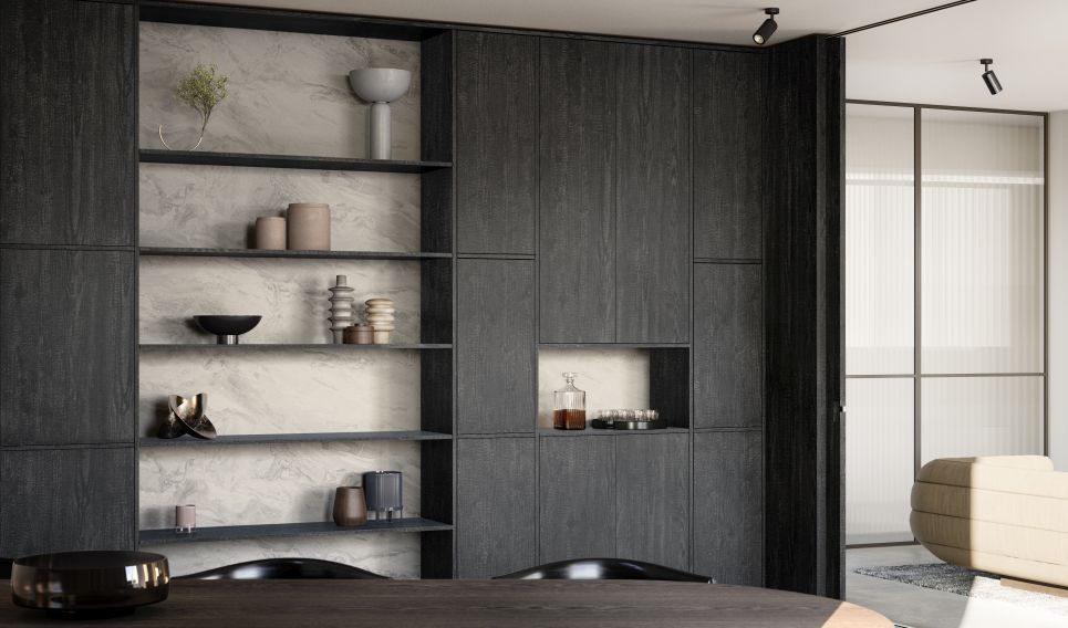 Laminex Shou Sugi emulates the glossy, cracked surface of Japanese charred timber. Contrasted with the swirling stone patterning of Laminex Pietra Cloud, it provides a textural take on a monochrome interior.