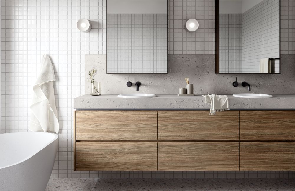 Inspired by the worldwide popularity of terrazzo surfaces, Laminex Tumbled Terrazzo has contemporary graphical appeal, but with a neutral colouring that sits comfortably alongside the authentic woodgrain of Danish Walnut.