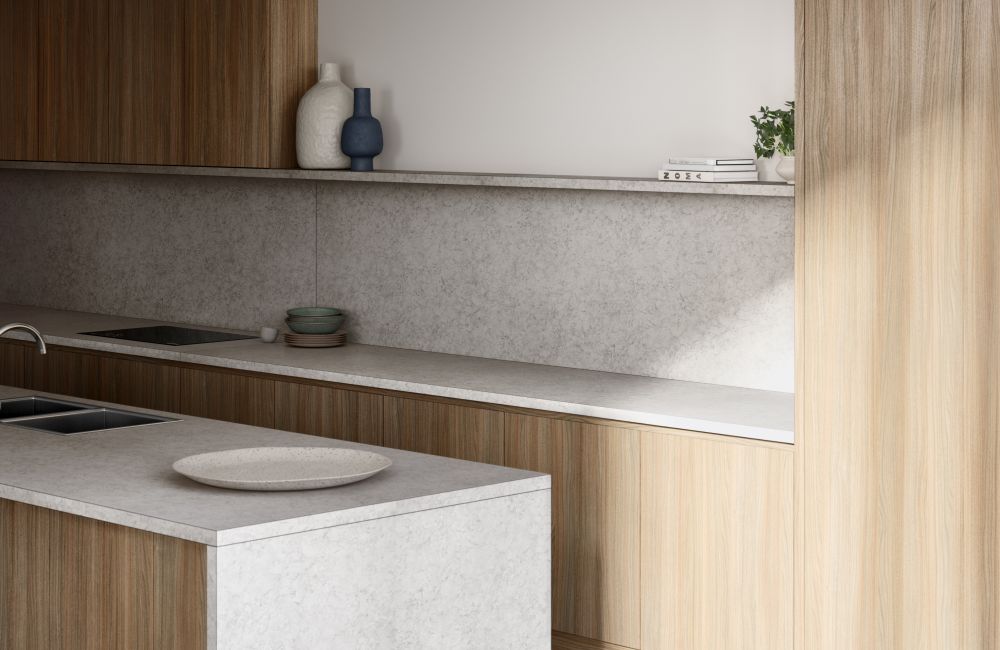 Laminex Danish Walnut evokes classic mid-century design with its rich colour and subdued woodgrain patterning. It makes for a luxurious pairing with the softly contrasted grey marbling of Laminex Figured Limestone.