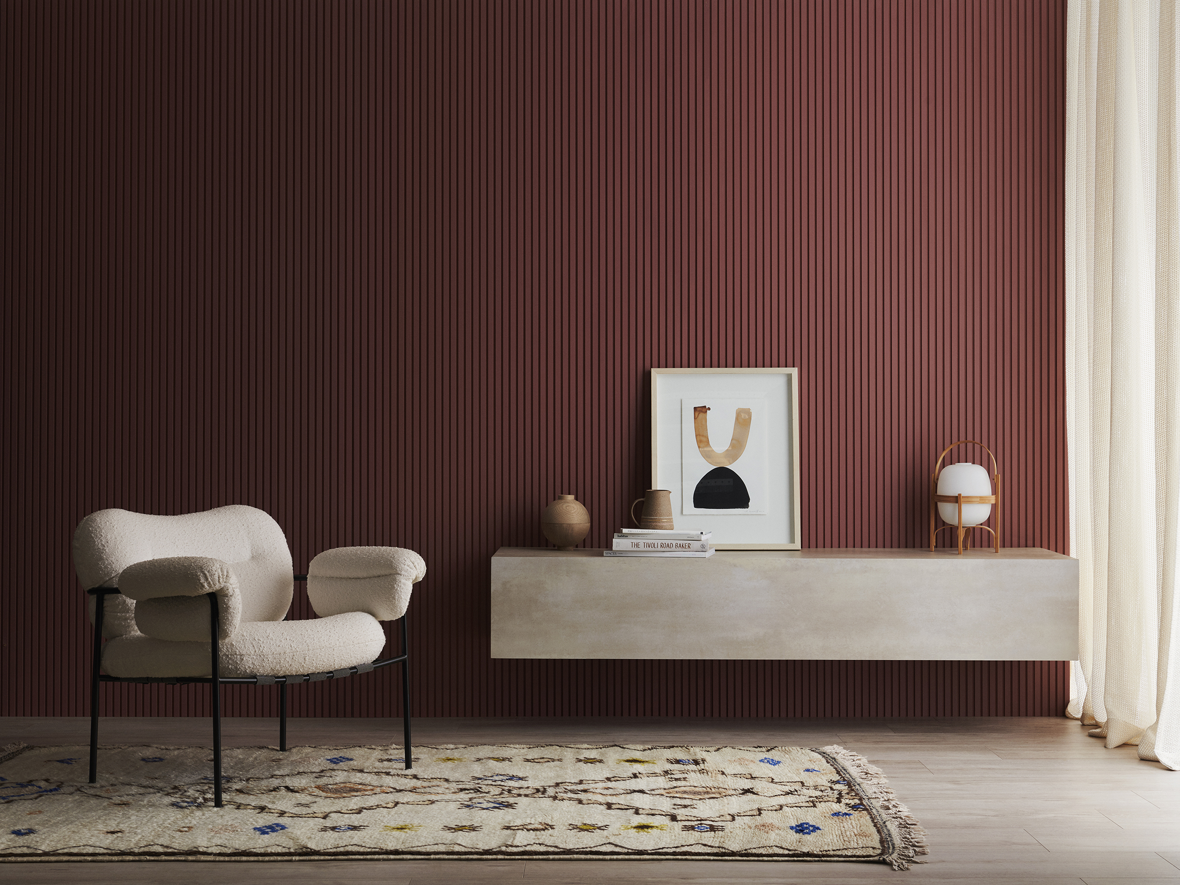 A Surround by Laminex feature wall adds sophsication and style to this living room