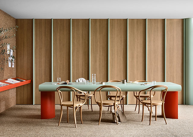 Kennedy Nolan’s artful use of Laminex® laminate in this contemporary workplace explores the material's inherent design flexibility with an energising mix of colours, curved surfaces and natural woodgrain texture.