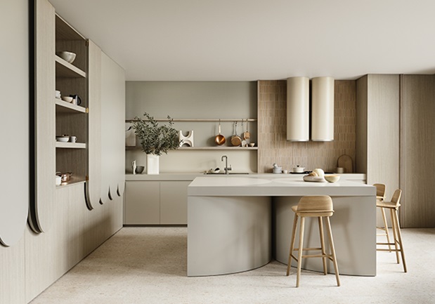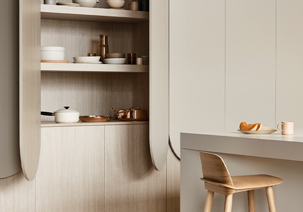 A celebration of sculptural curved surfaces, muted organic colour and soft woodgrains at the heart of the family home.